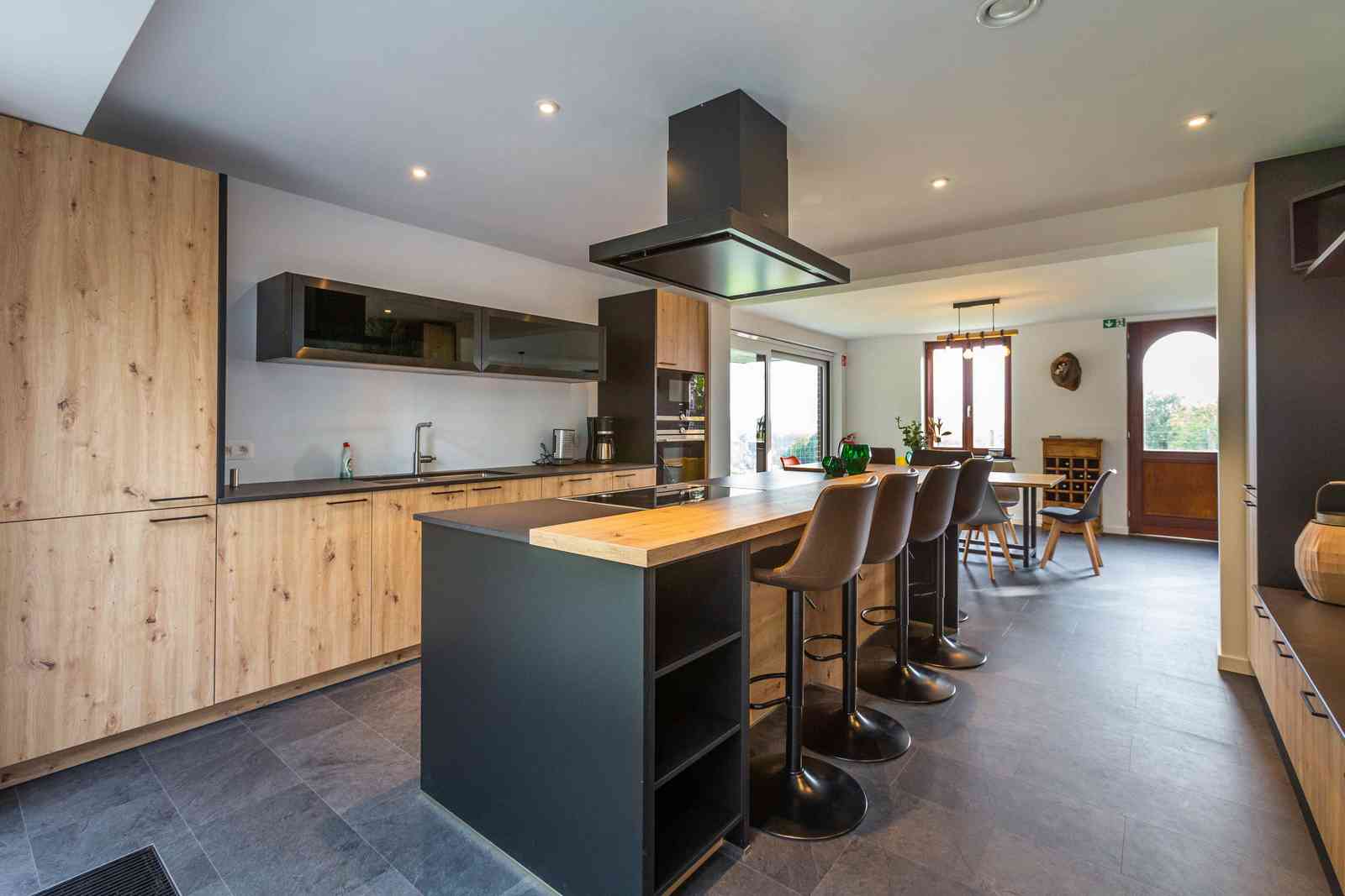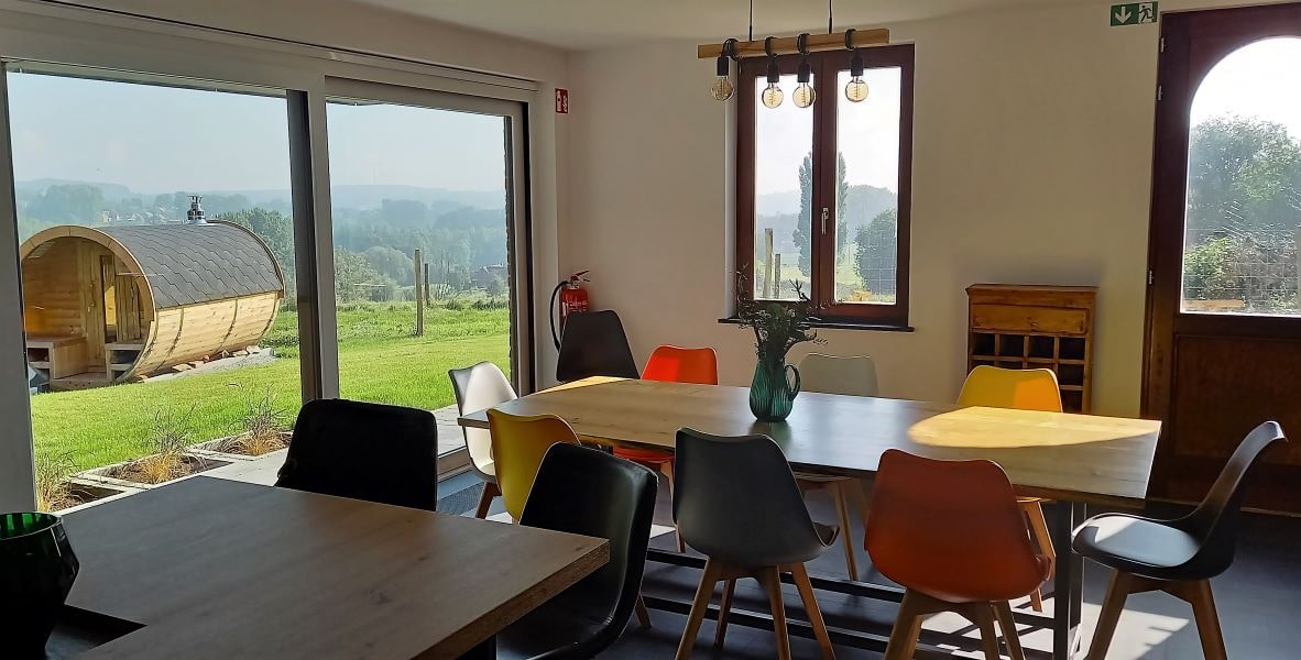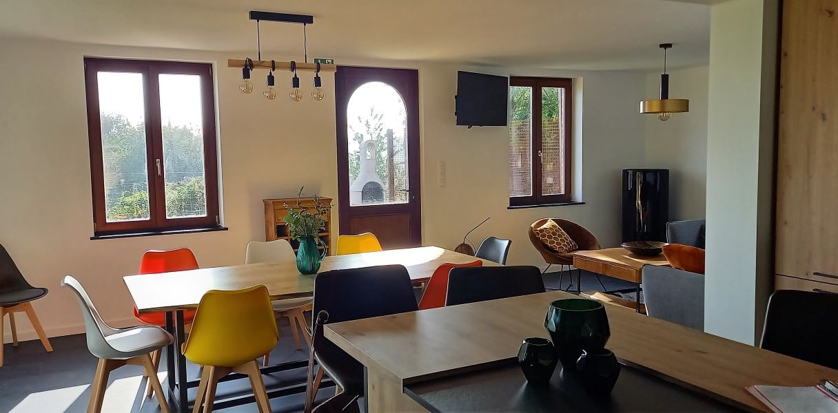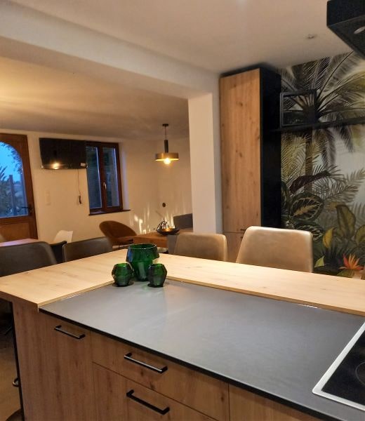 Réservez Le gîte dispose d'une magnifique cuisine contemporaine dont l'îlot central, ouvert sur la salle à manger et le salon, confère au lieu le charme et convivialité que les hôtes ont voulu apporter à cet espace.