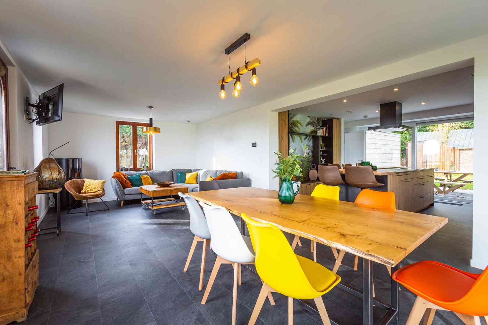 Les baies vitrées présentes dans le salon et de la cuisine baignent les pièces d'une lumière agréable et vous font profiter des panoramas incroyables. Quelques tableaux et pièces du mobilier, réalisés par des artistes locaux amènent un cachet et une typicité particulière au lieu.